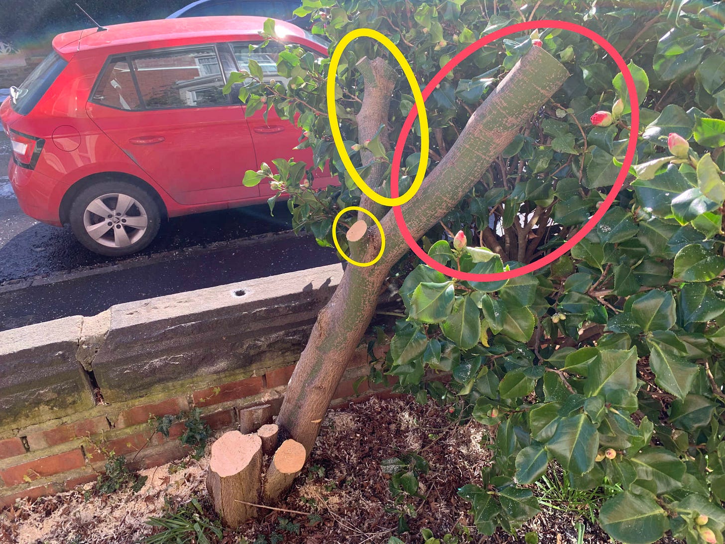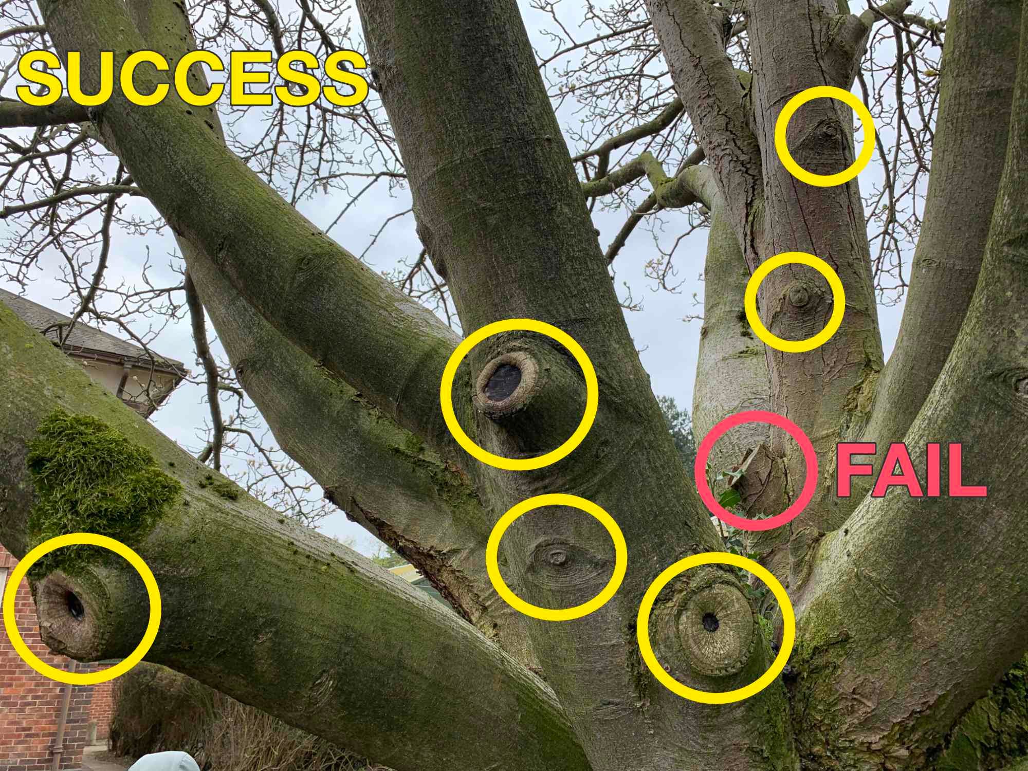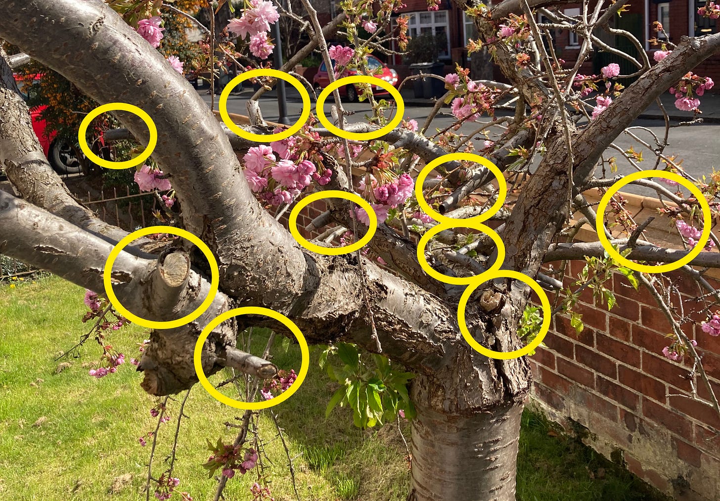 Here’s another example of bad pruning using the stump cut technique. This tree belongs to a friend. He emailed this picture to me as "I had correctly prophesied" in September that the tree would blossom in April3. I should point out that he inherited this tree as part of a property purchase. He didn’t butcher this tree, the previous owner did. Every one of these yellow circles4 is a stump cut. This tree will die soon in any case, as there is a lot wrong with it, but this army of stump cuts isn't helping matters at all. My friend calls it the “haunted-ass frankenstein tree” which is pretty spot on.