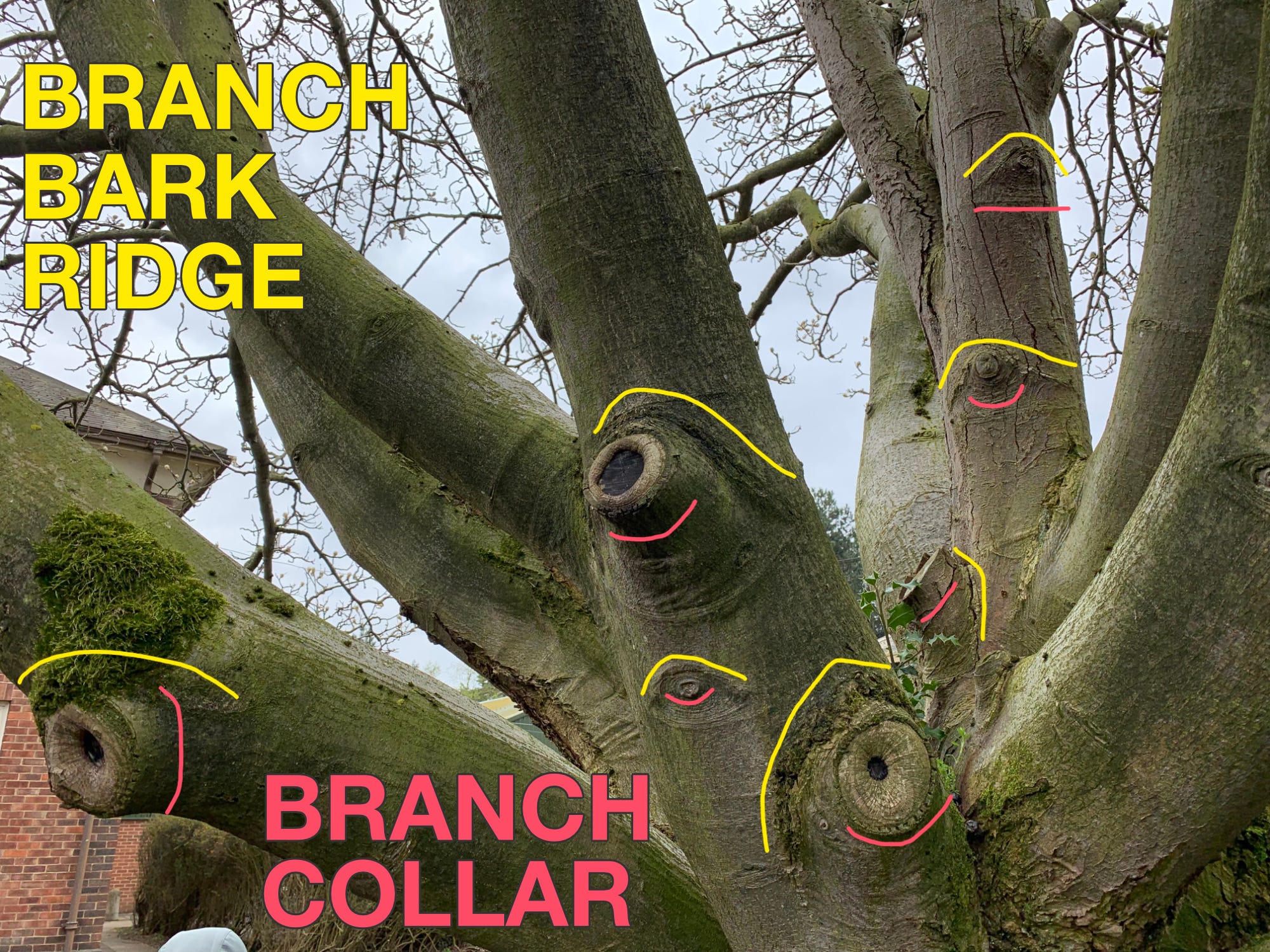 In the photo below, just under each yellow line you should be able to make out a distinctive line where the bark of the main limb fuses into the branch. This is called the branch bark ridge. Above each of the coral lines is the region called a branch collar. I’ll go into the depth of why natural target pruning works in the future, but all you need to know is that if a pruning cut is made so that it starts just in front of the branch bark ridge and ends just in front of the branch collar then the CODIT response should initiate and the donut will form.