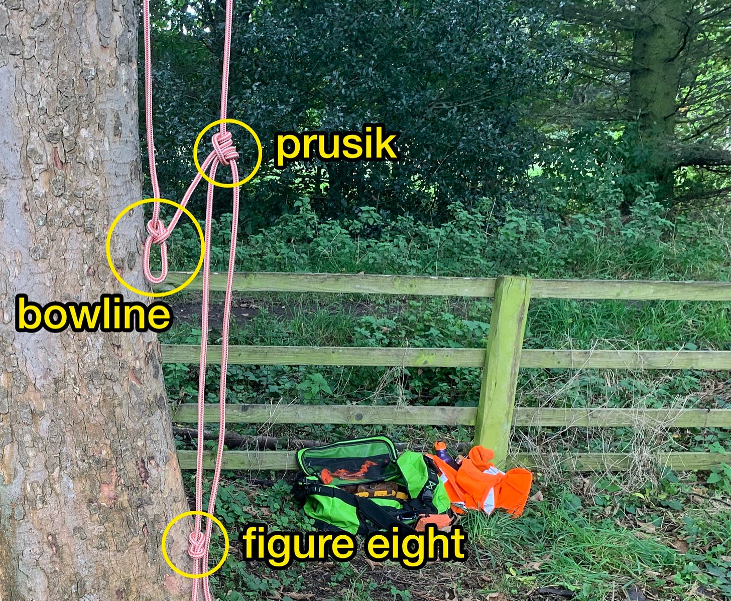 Once we’d discussed the climbing plan, it was over to the three knot system which is an emergency situation thing. The general idea is that using only a single piece of rope you are able to create a system that could, if it had to, be used to ascend or descend from a tree. It comprises of a bowline (you attach to this), a friction hitch to capture progress (I used a prusik, but you could also use a blakes hitch) and a stopper knot to ensure you don’t pull your rope through your friction hitch and fall and die. In essence it is the same as the system I used to climb on, only instead of a bowline I use a spliced eye on the rope and instead of a manually tied prusik, I use a prusik loop. The figure eight stopped knot is always used.