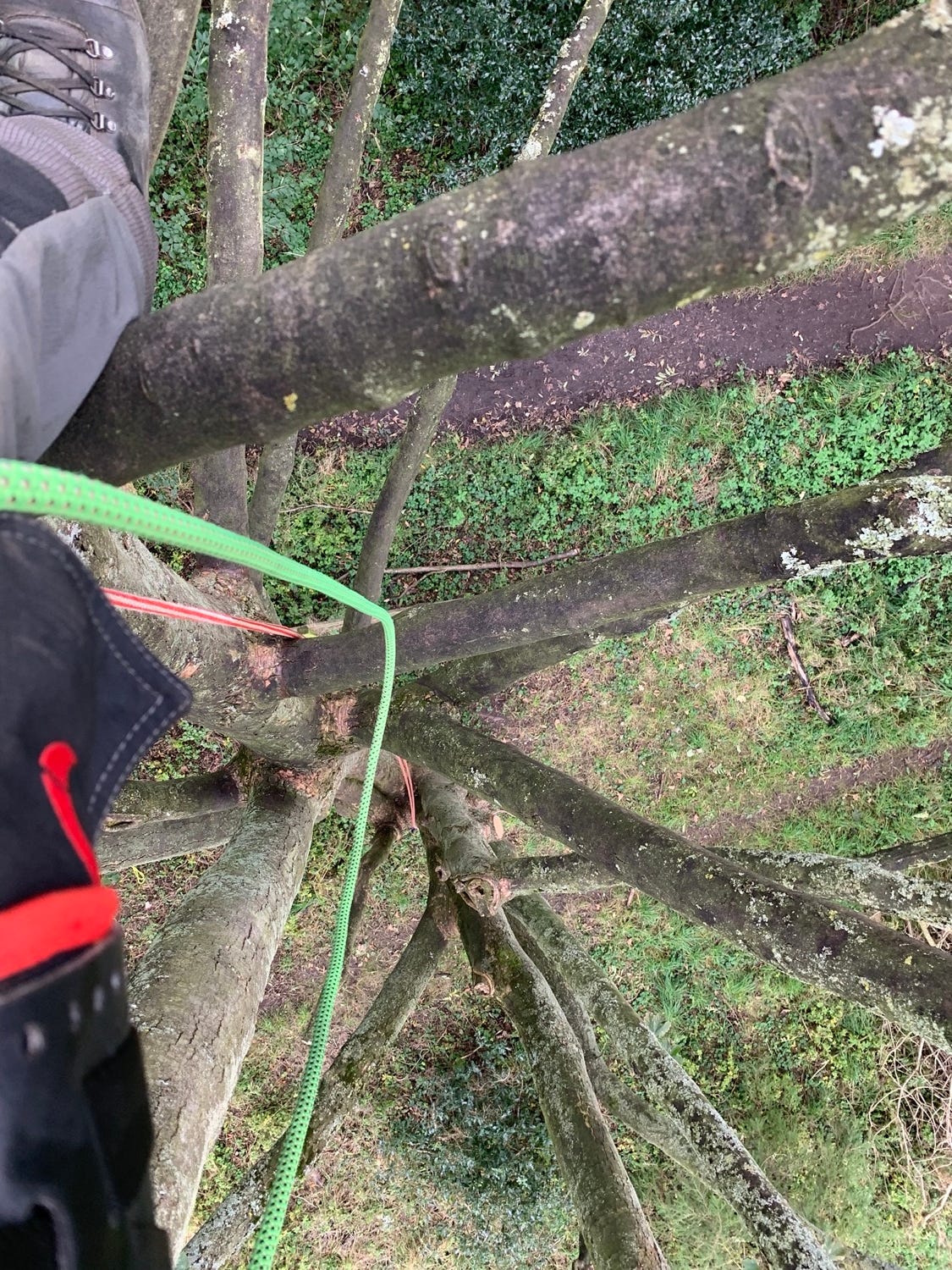 The tree I chose to climb was the above beech tree. It has been climbed a lot and pruned a lot. It is in decline and whilst it is safe to climb, it is a bit of a bugger to climb. Thanks to the pruning, many of the more helpful climbing limbs have been removed. As it is an old tree, many limbs that would be useful are decayed and cannot support the weight of a human on ropes. In short, of the six trees we could have chosen, I chose the hardest one for me. I had climbed this tree before so it was not new to me, but that was a while ago and I distinctly remember how hard limb walking in the tree was due to the fact that there were few limbs less than 40º in angle.