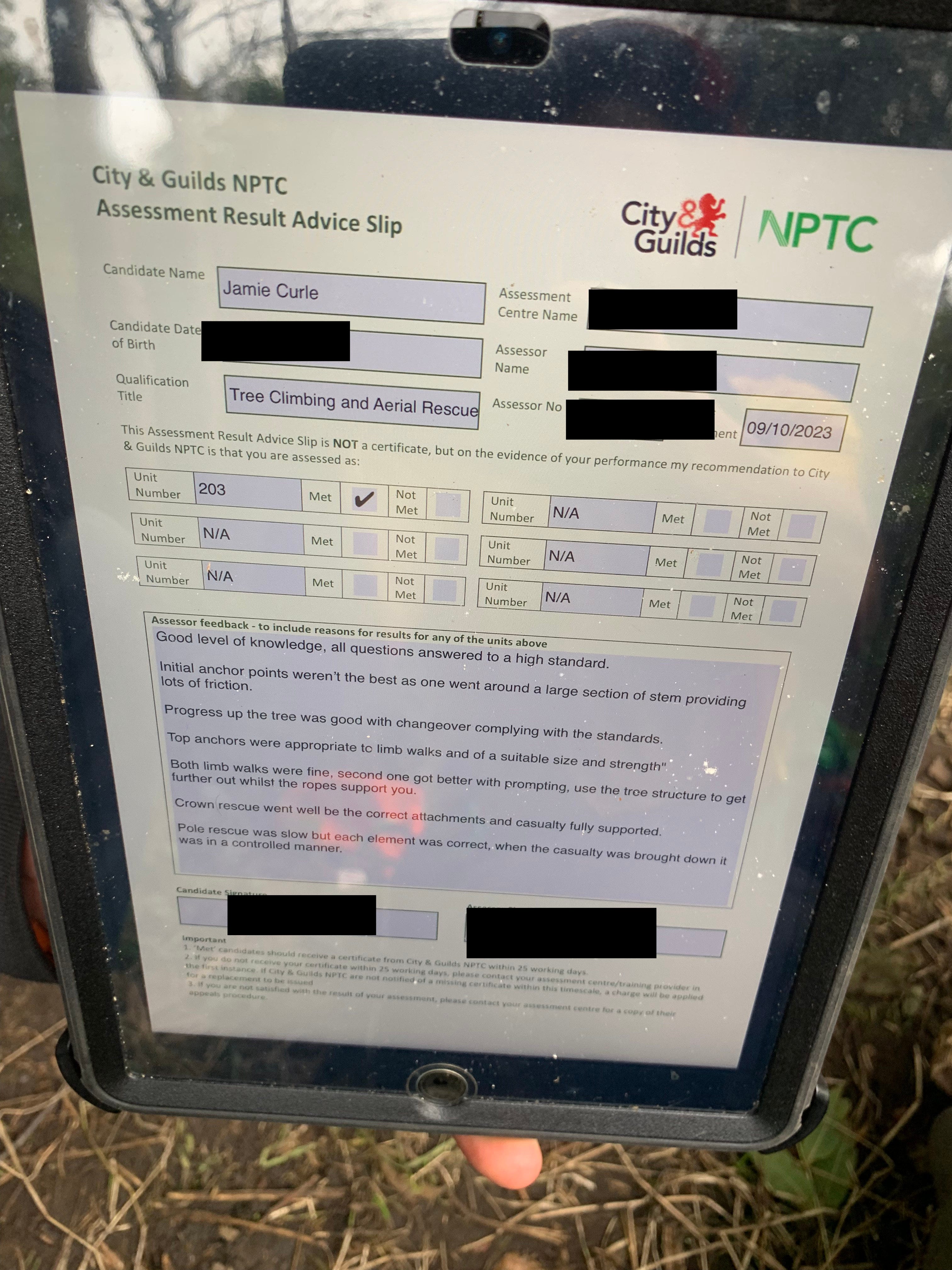 I passed my Tree Climbing & Aerial Rescue (CS38) assessment.
