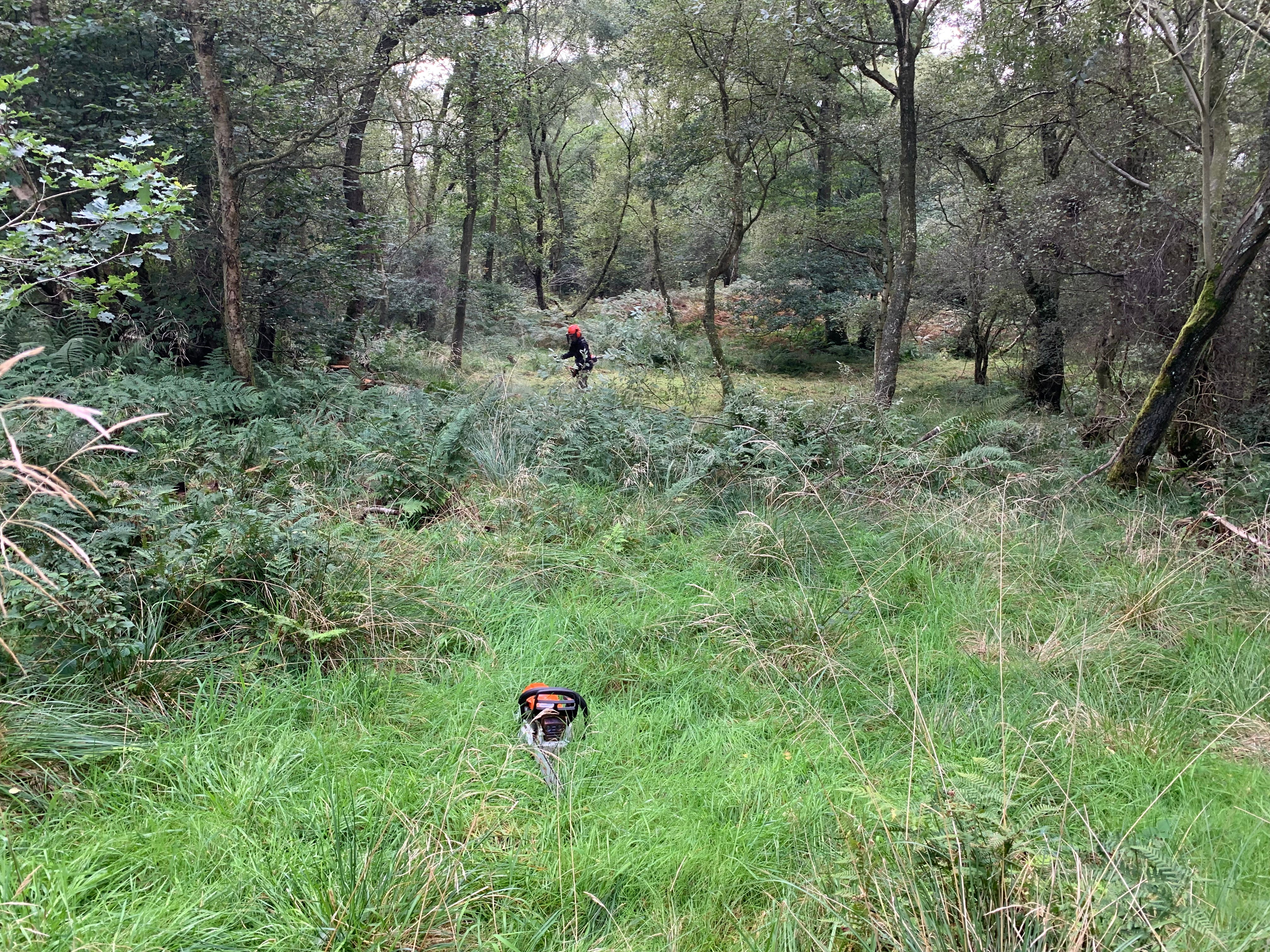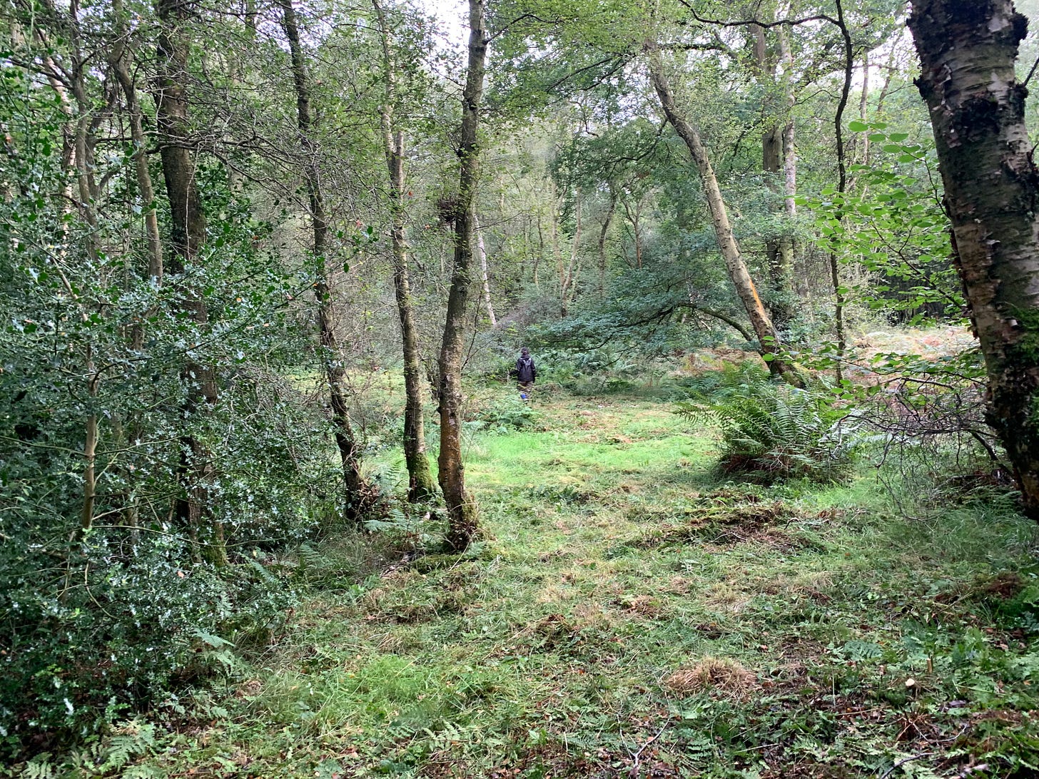 We found a nice rhythm as we worked. I tended to go ahead with the saw and decide on the path forward. My decisions being based on longer term management goals. Always stay away from the young oaks, ideally go through open space, but if you have to remove something, then aim for smaller, low quality malformed birch or trees that are being killed by ivy. Never cut the hawthorn - the faeries don’t like it and you don’t want to piss the fae off. Especially in a woodland in which you climb trees.