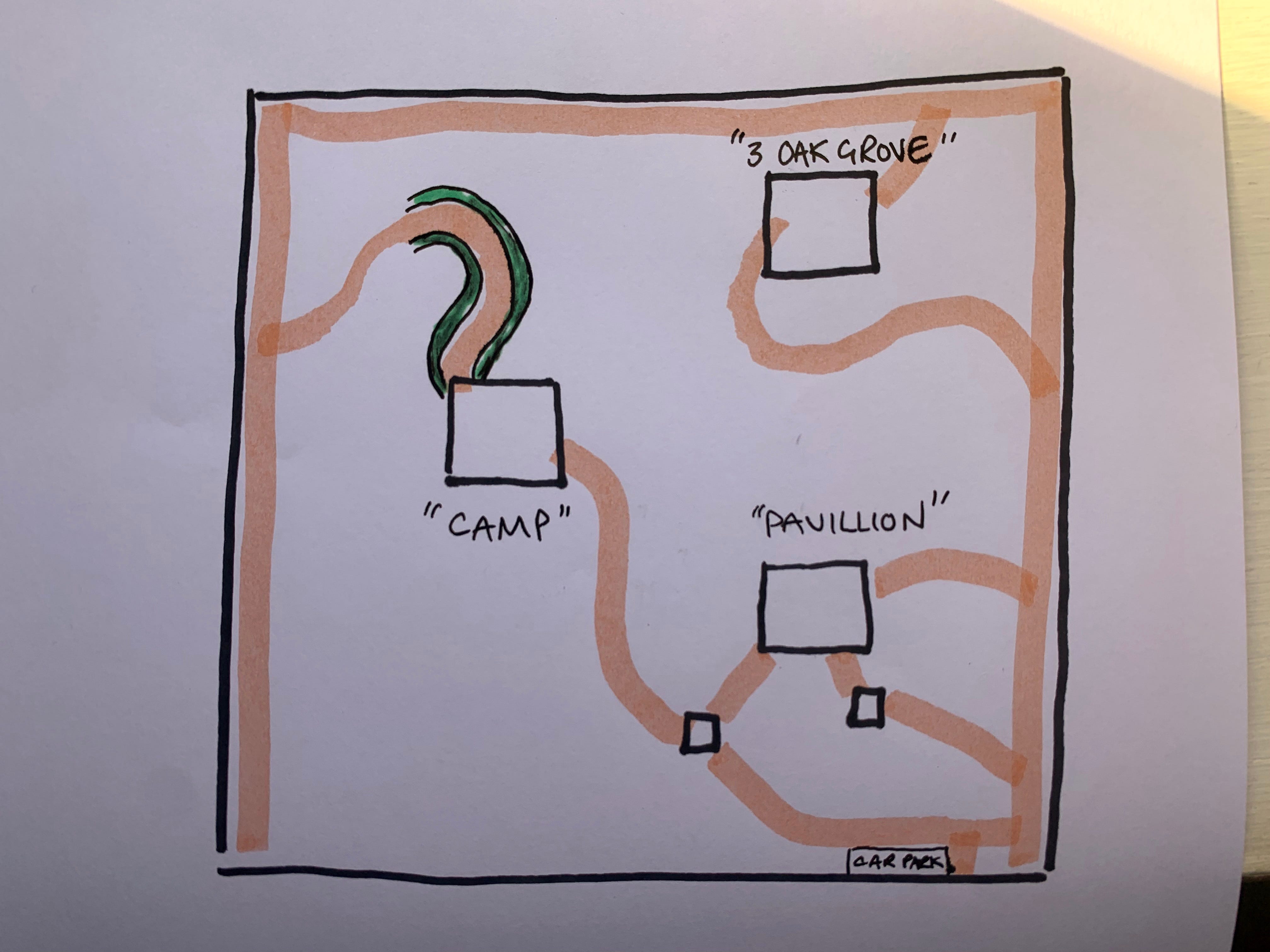 Here’s a sketch of the woodland as it is today. The rides are the peachy lines and our amenity areas are outlined in black. I’ll go into the specifics of the amenity areas in the future as I don’t want to go too off-topic. Nothing on this little sketch is “to scale” and locations are approximate. The section of ride Mrs Treedom and I cleared was the area to the camp which I’ve highlighted in a green line.