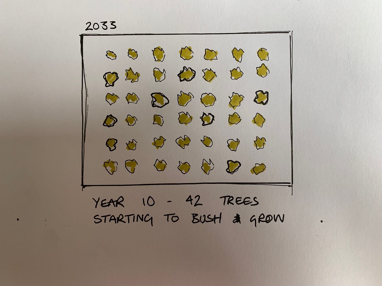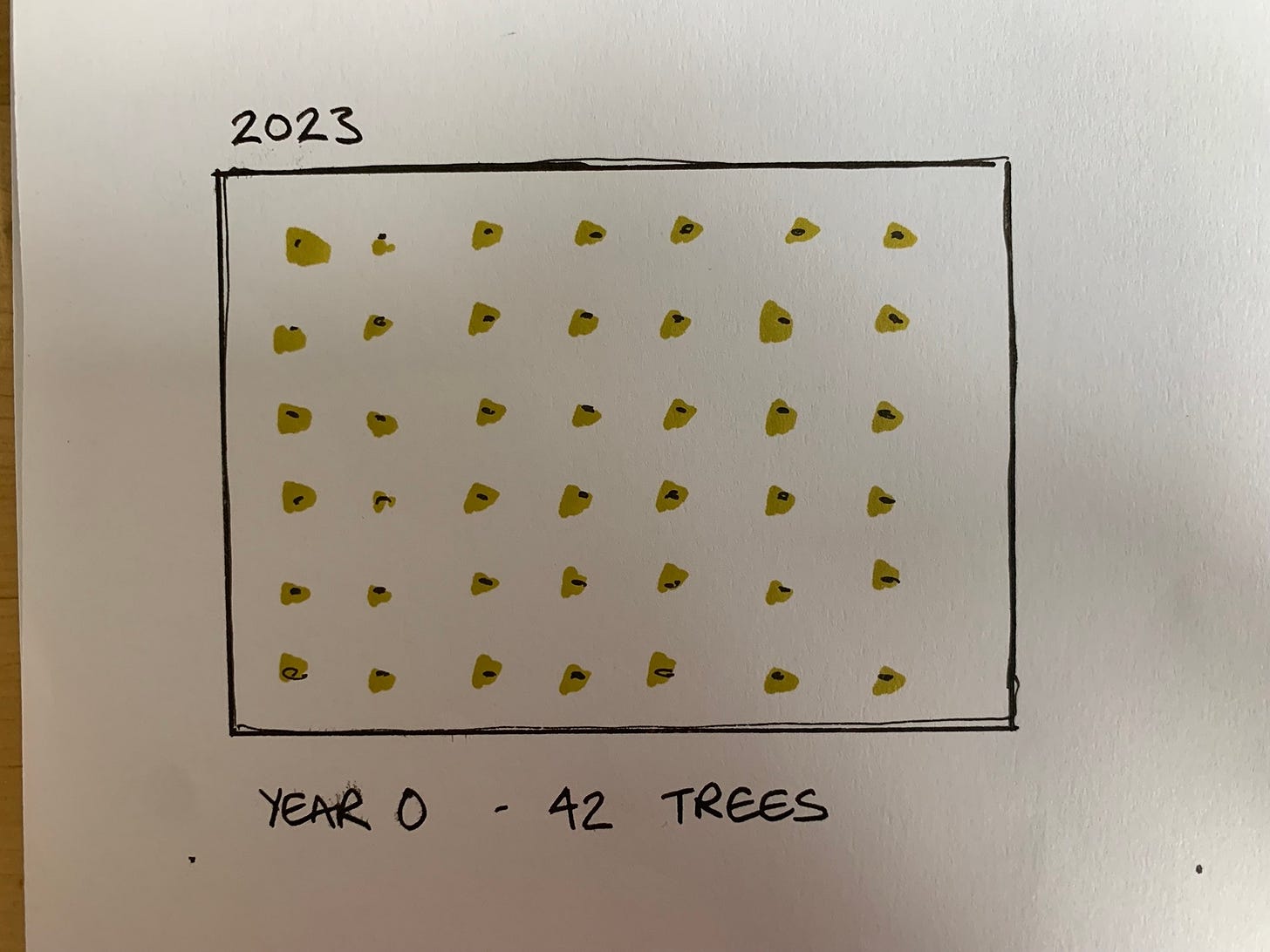 Bob planted his trees at 2 metre spacings, so in total he has 42 trees. This arial view really does show how small the 16 × 14 metre site is. Fortunately for us, it makes drawing it very easy. If you’re wondering why you’d place the trees so close together, that shall become apparent in the future.
