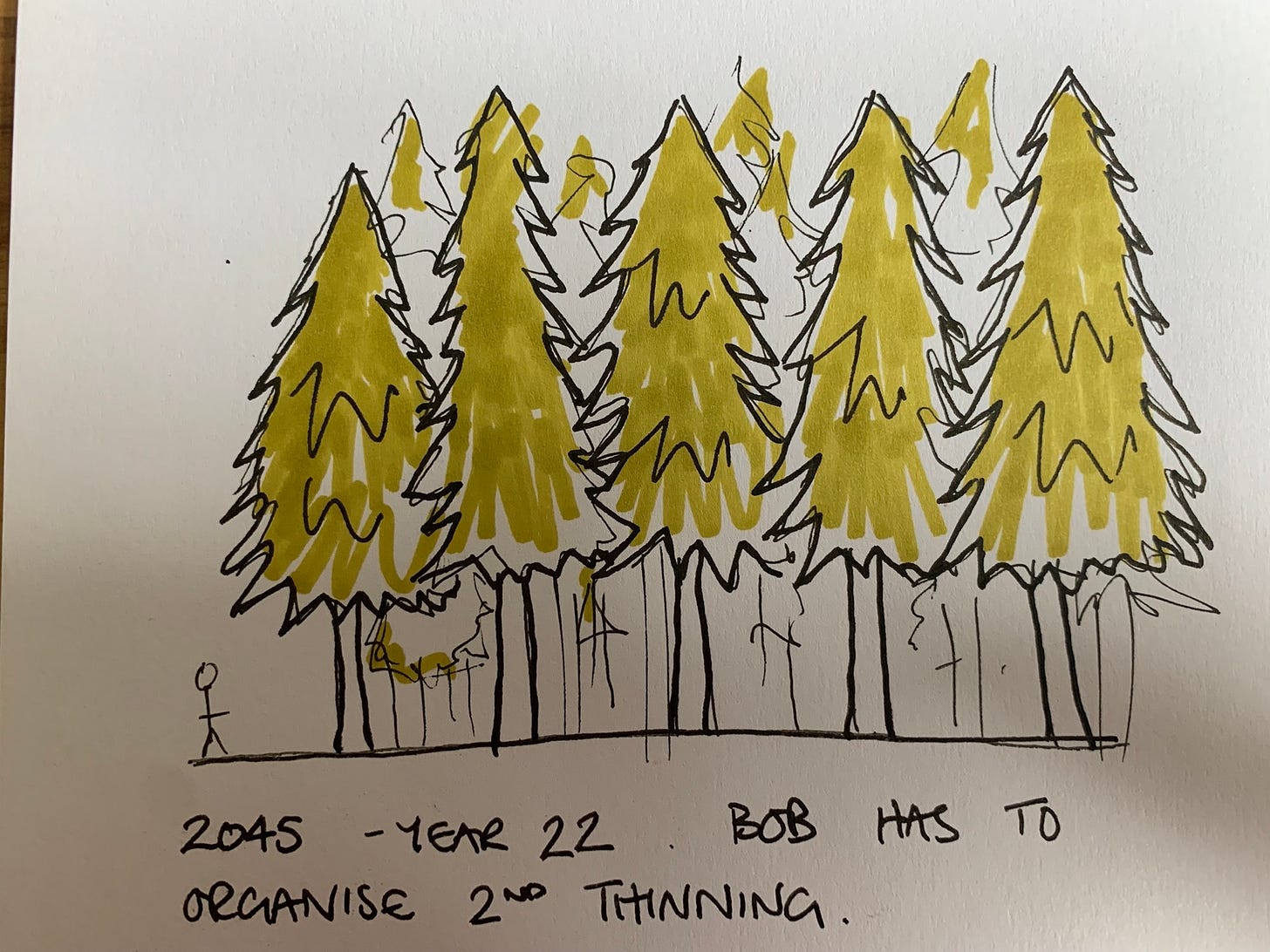 Back to Bob’s woodland plantation. He’s going to be thinning 50% of it, which is way too aggressive for a real world plantation, but as this woodland is an example, it’s fine and helps keep the maths nice and simple. Bob will be doing the thinning - he may be in his sixties but he is firmly in the “use it or lose it” camp. Good for Bob. Everyone should be more like Bob.