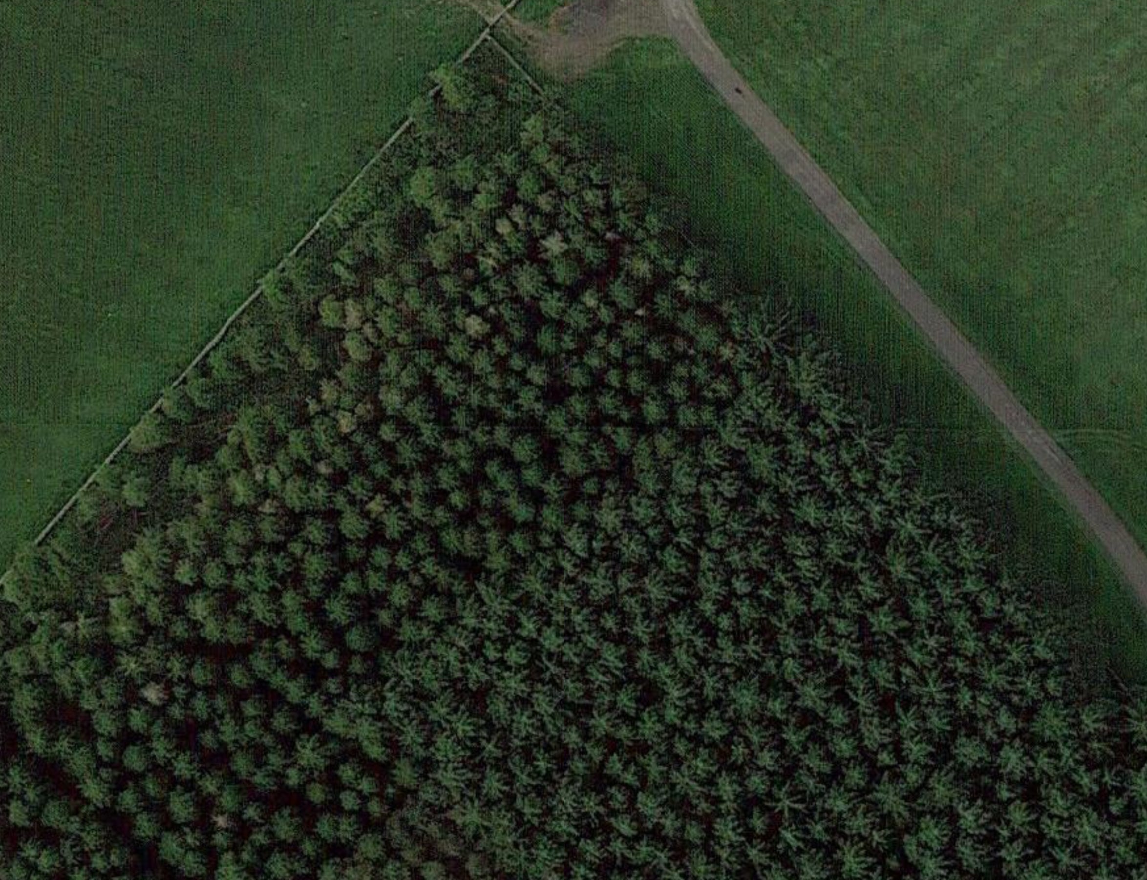 Here’s a screen grab from a Google Maps of a plantation in Northumberland before the site was clear felled (meaning everything is felled) in 2019. It was re-planted by myself and three others in 2022/23. These were big trees, some of the stumps were in excess of three feet. Note how they are all tightly packed together. This is one way to grow straight timber. In just the section you see here, we planted at least 1000 trees.