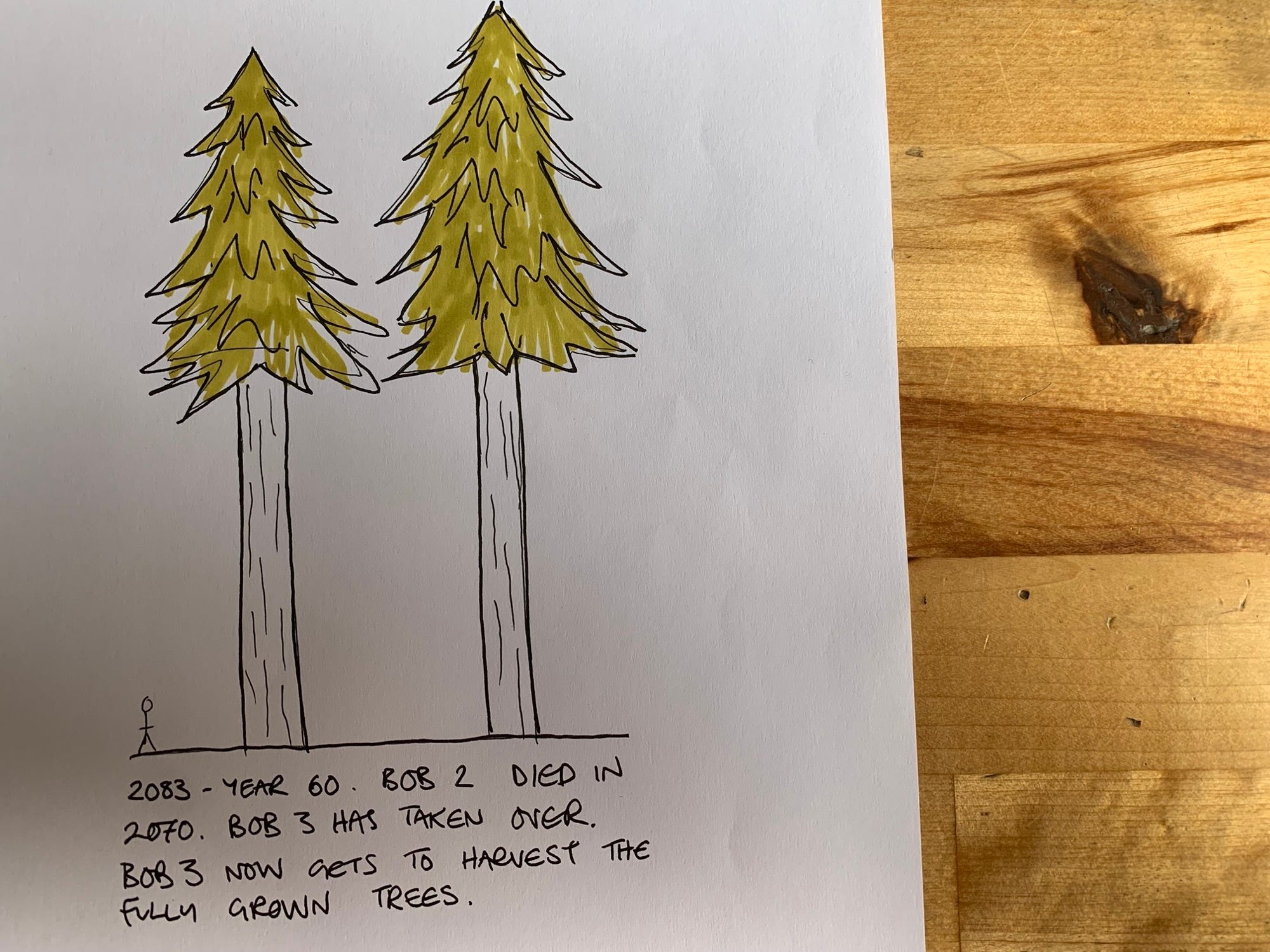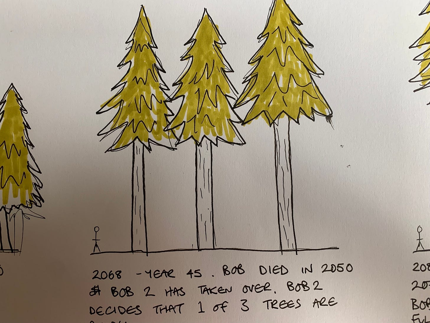 Obviously, once these trees are felled the ground will be just as it was in 2023 and ready for planting again. Maybe Bob 3 will start the cycle again so that Bob 6 gets to harvest more trees in 2143? In truth, no one knows what will happen. The past and future are always ideas.