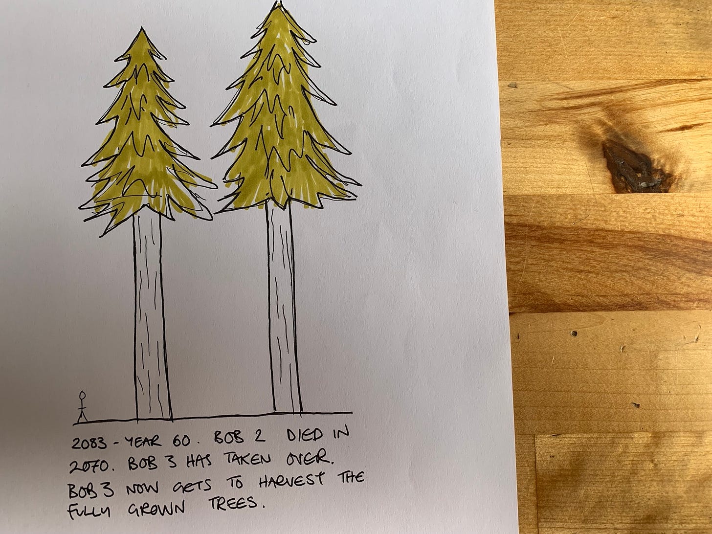The idea of Bob dying and being replaced may seem like somewhat of a joke but there is a point to be made. Much of woodland work spans generations. By the time the woodland I planted at in 2022 in Northumberland will be ready for harvest at some point in 2080, I will be over one hundred years old and odds are - quite dead. Think about that for a moment. Not many industries have stark reminders of your mortality like this. Did you start a project at work this week that won’t complete until so far in the future that you’ll be dead?
