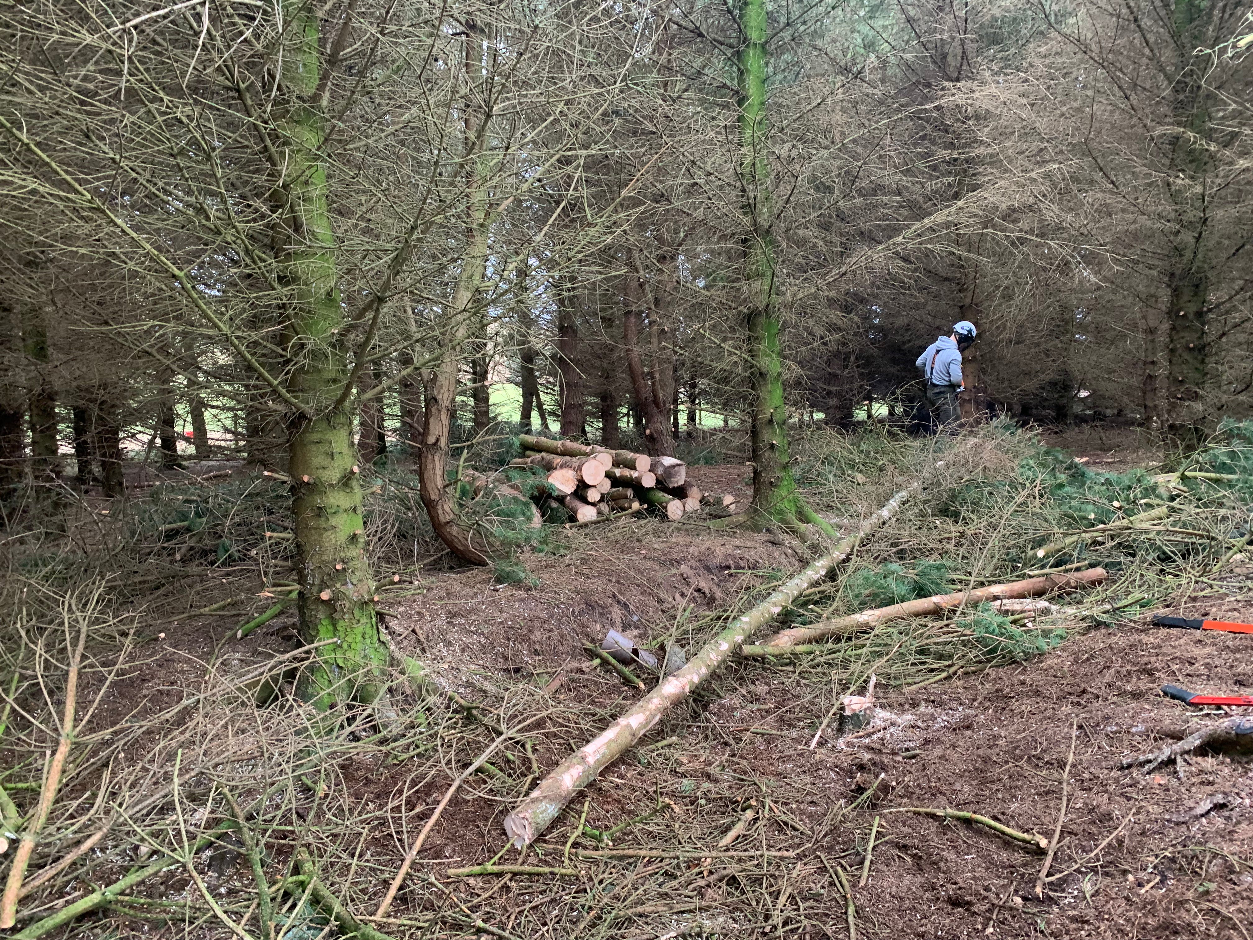 In terms of what to do with the timber, in the treeschool City & Guilds exam I had in March 2023 (still await results - suspect passed), the specification was to cut the timber into two metre lengths and stack it no higher than one metre in height. At my recent NPTC felling exam (I passed - yay) which was also a thinning job, the spec was two foot lengths.