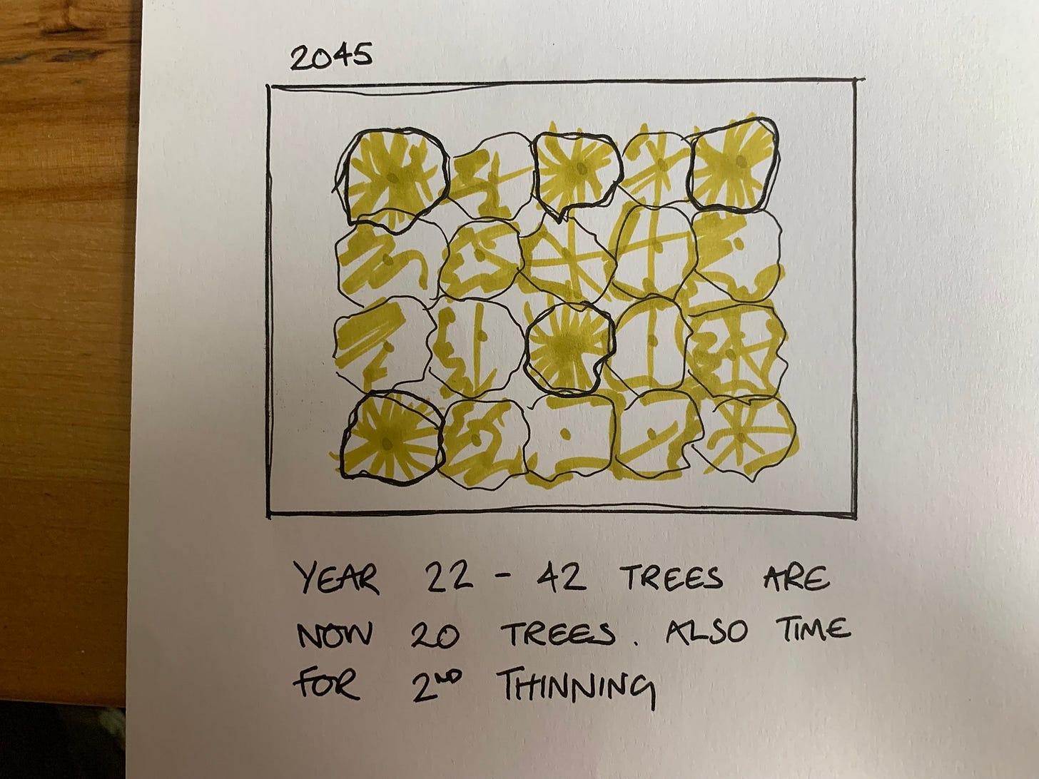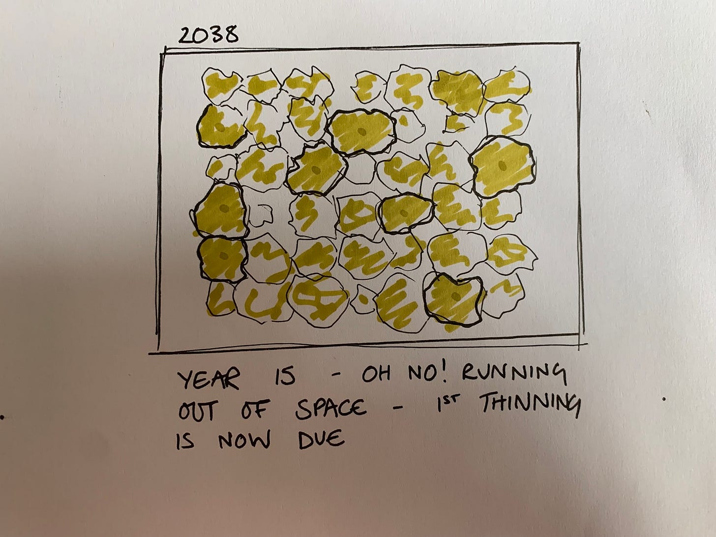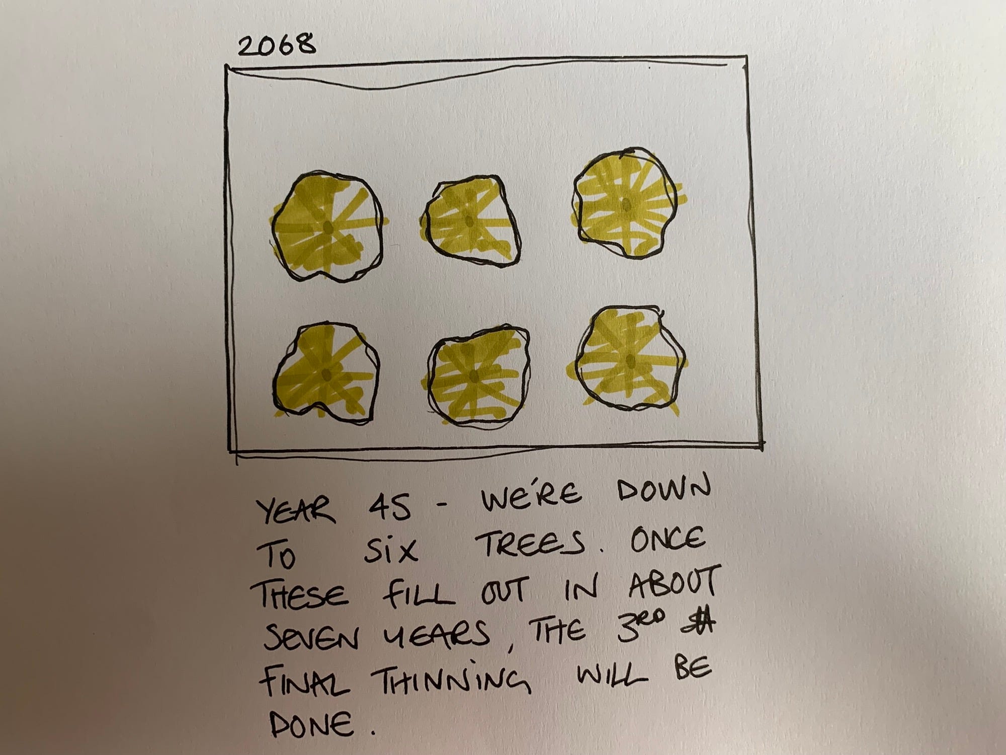 Back to Bob 2. The second thinning resulted in the woodland being cut back rather aggressively into just six trees. In 2023, Bob started off with forty two trees and now in 2068 we are down to six.