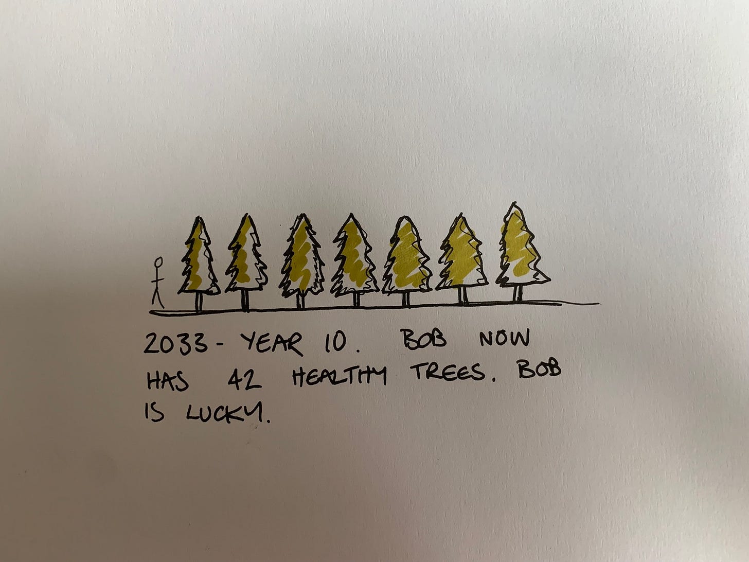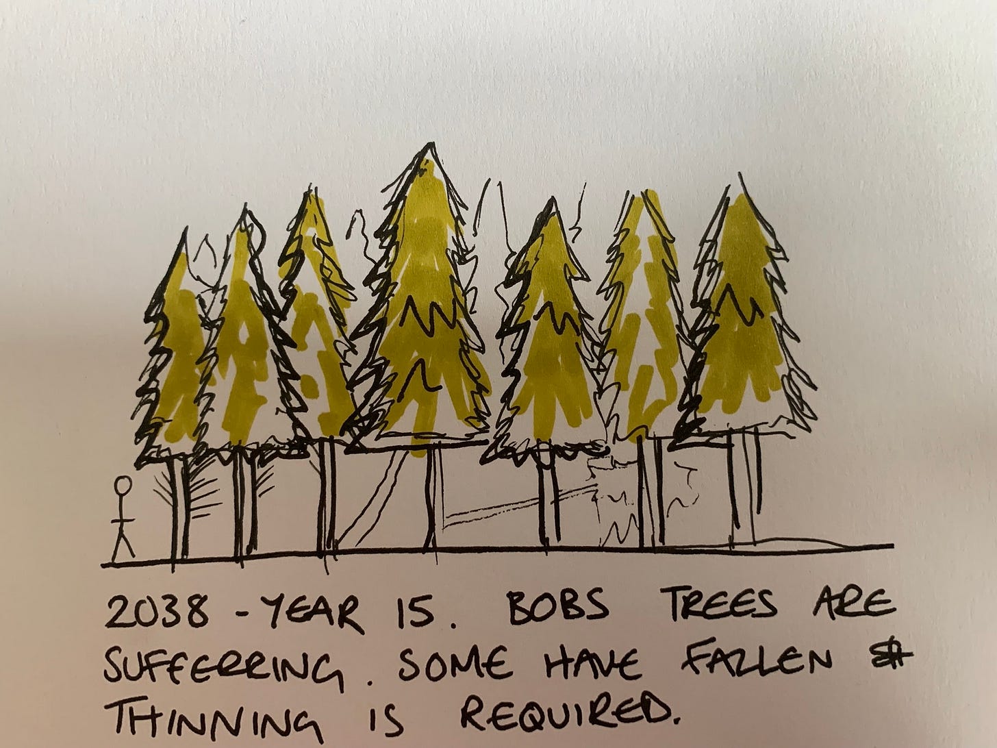 There’s a process called “beating up” which Bob will have to do one year in the future. Beating up simply means replacing all of the trees that have died in their first year. As Bob has planted the Arboriculum coniplantata species, none will die as it is very hardy species and makes this best case scenario easy to write about.