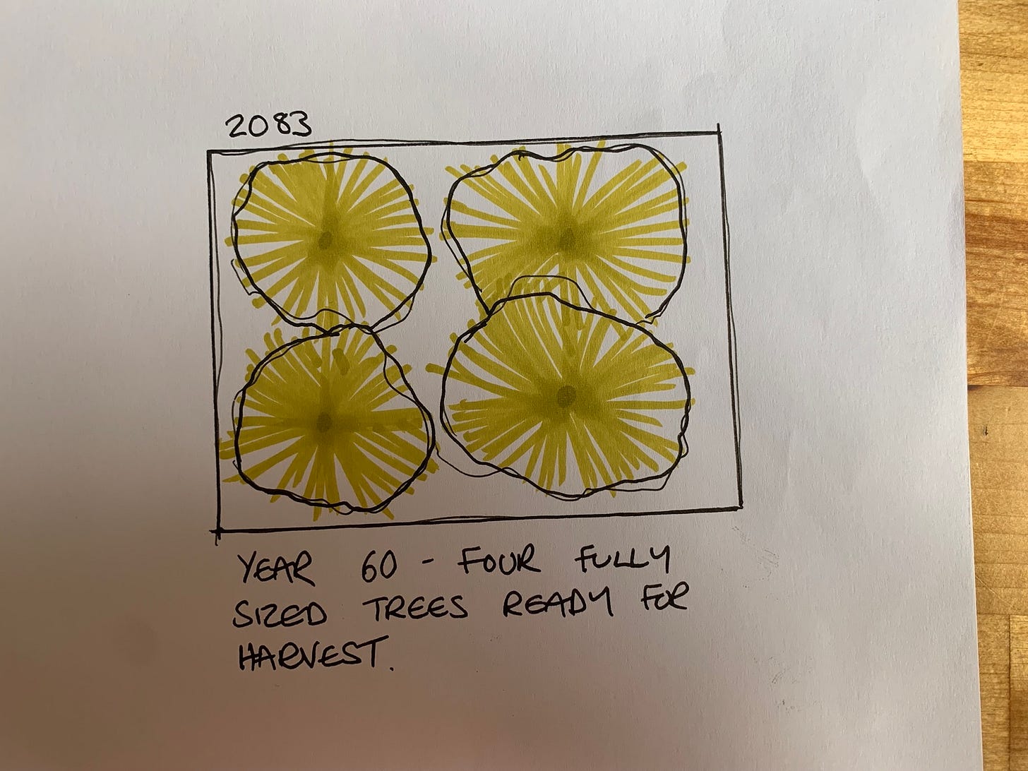 What was once a field of 42 saplings in 2023 is now a stand of four mature Arboriculum coniplantata ready for harvesting in 2083.