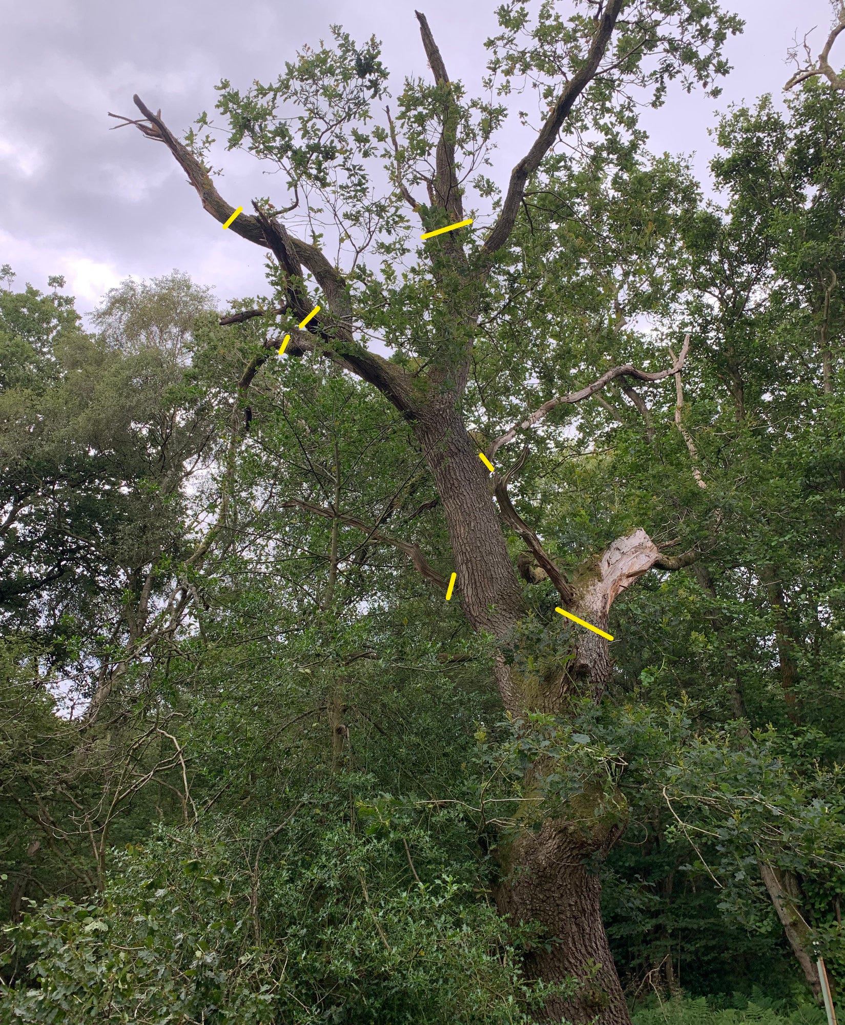 The plan is pretty basic - I’m going put clean cuts on the torn tissues to minimise the surface area for ingress of pests and diseases. These correctly located pruning cuts perform two functions. Firstly, the smaller surface area would make it easier and faster for the oak to seal up the wound and harder for pests and diseases to get a hold in the tissue. Secondly, it would cause the oak to respond with new growth shoots, which would eventually (measuring in decades) give it a new canopy. It’d also give me something to prune each year for next twenty years or so years.