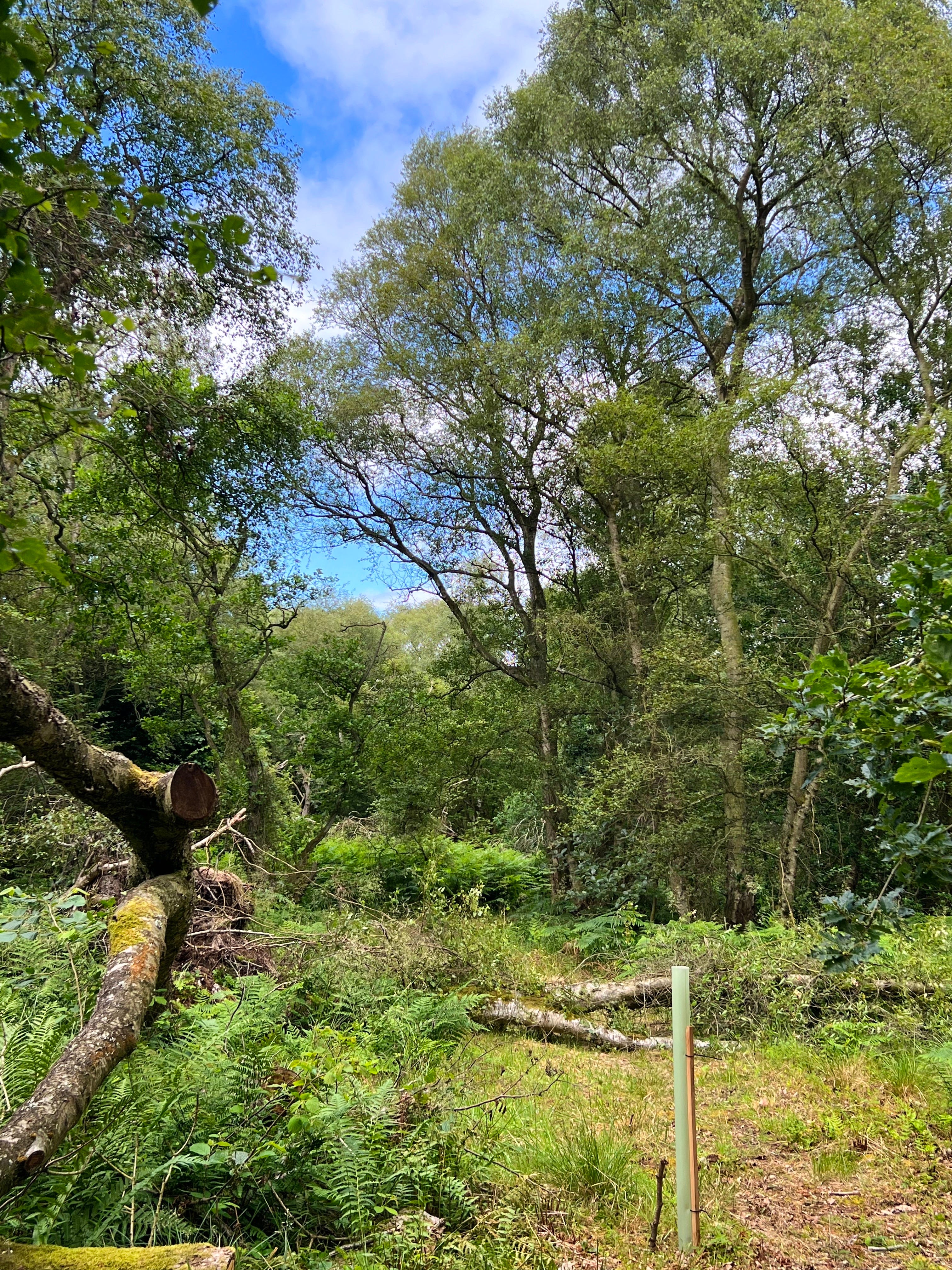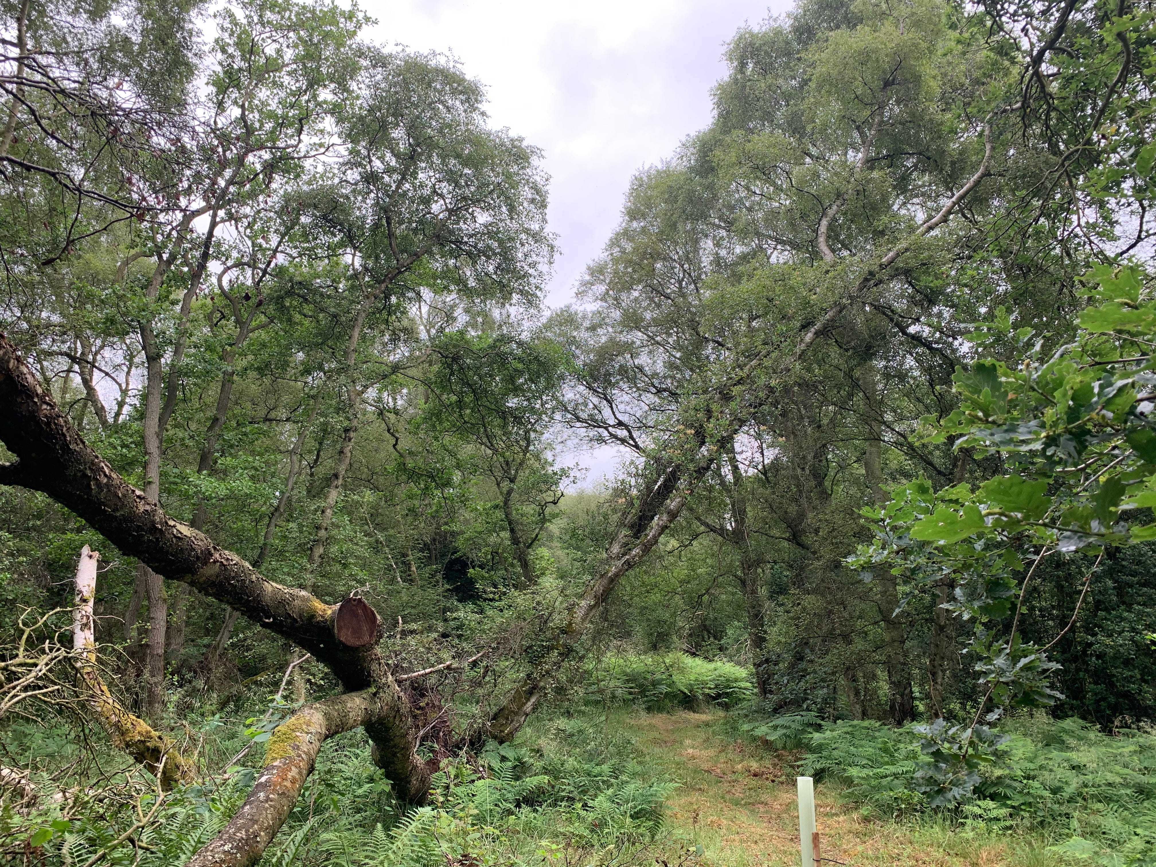 Looking above the path you can see a birch tree that became windblown a few years ago. The only thing stopping it from falling to the ground is a rather stout oak tree and you can see some of its foliage in the right hand foreground.
